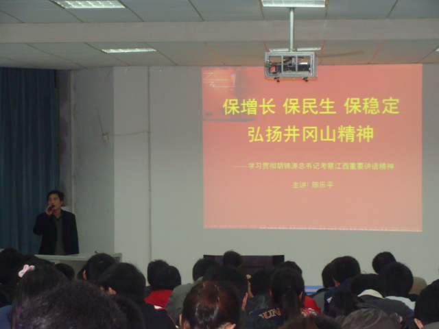 3月27日晚7:30,材料学院党校紧紧围绕学习科学发展观和胡锦涛总书记在江西考察工作的重要讲话精神,给入党积极分子上了一堂生动的党课。党课由学院党委副书记、副院长陈乐平教授主讲。在课堂上,陈书记讲了在当前国际金融危机的形势下,我国政府全力以赴保增长,千方百计保民生,加大力度保稳定,清醒判断,并出台一系列惠民政策,坚持以人民的切身利益为工作的出发点和落脚点,并且不断发扬井冈山艰苦奋斗的红色精神。会上,同学们还观看了胡总书记在春节期间到江西南昌看望慰问干部群众的新闻视频,这充分体现了中央和总书记对老区人民的特别关爱和对江西工作的高度重视以及对江西广大干部群众的殷切期望。最后,陈书记还勉励在座的同学,要以一个共产党员的标准严格要求自己,刻苦学习,不断进步,在学生中充分发挥模范带头作用。同学们以热烈的掌声感谢陈书记的精彩讲课,并纷纷表示对“三保一扬”有更进一步的了解和更深入的理解。
