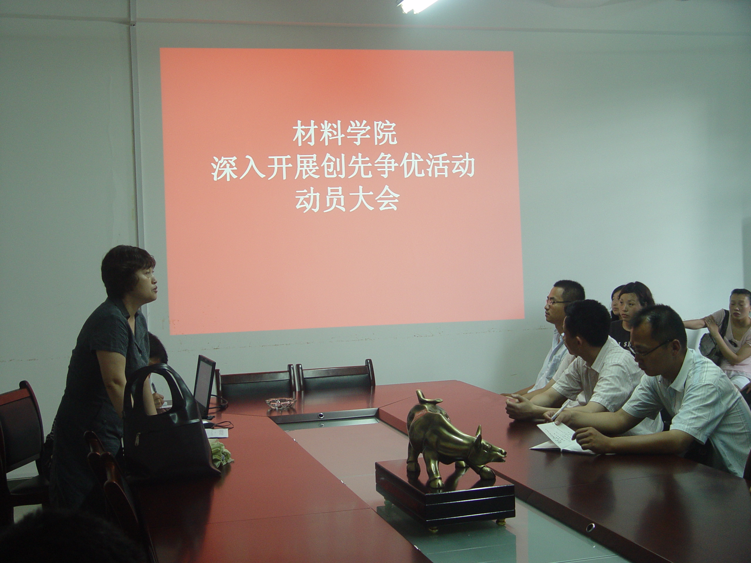 2010年7月1日,中国共产党建党89周年,值此我党周年纪念之日,材料学院党委在F109召开材料学院深入开展创先争优活动动员大会,会议由学院党委书记赵晴教授主持,全体教工党员参加了本次大会。会上,赵书记首先传达了学校创先争优活动动员大会的有关精神和王书记、余欢校长在会上的重要指示,并对学校的《实施方案》作了详细的讲解,结合我院实际,作了具体的要求。