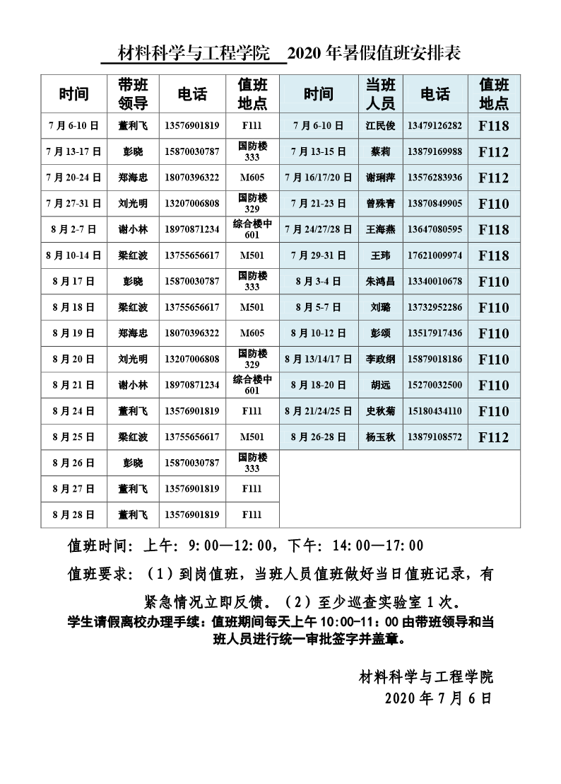 材料科学与工程学院2020年暑假值班安排表