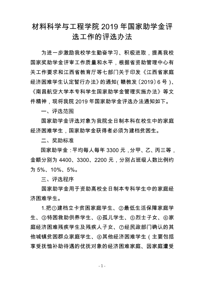 材料科学与工程学院2019年国家助学金评选办法